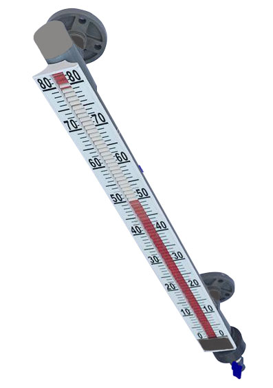 磁翻板液位計(也可稱為磁性浮子液位計)根據(jù)浮力原理和磁性耦合作用研制而成。當(dāng)被測容器中的液位升降時,液位計本體管中的磁性浮子也隨之升降,浮子內(nèi)的永久磁鋼通過磁耦合傳遞到磁翻柱指示器,驅(qū)動紅、白翻柱翻轉(zhuǎn)180°,當(dāng)液位上升時翻柱由白色轉(zhuǎn)變?yōu)榧t色,當(dāng)液位下降時翻柱由紅色轉(zhuǎn)變?yōu)榘咨?/p>